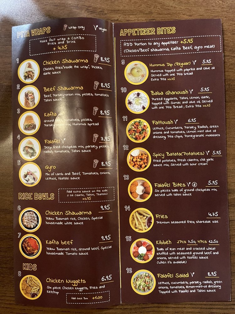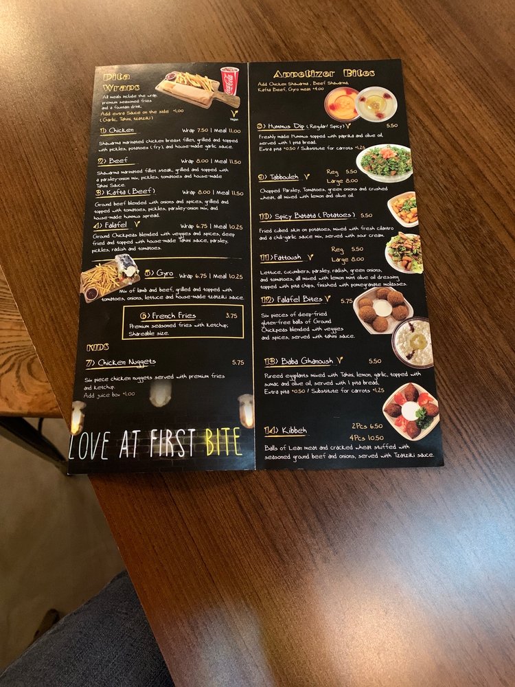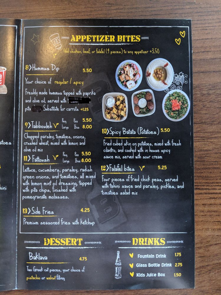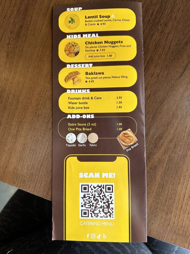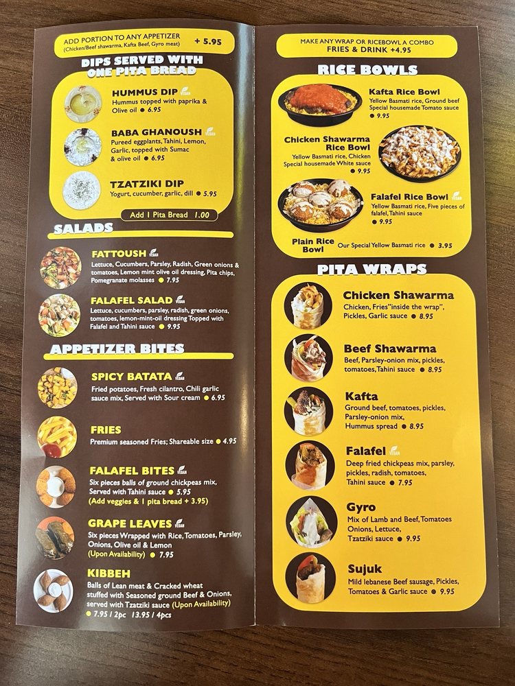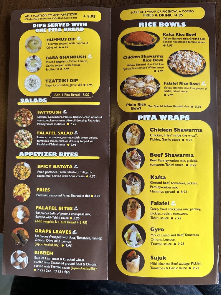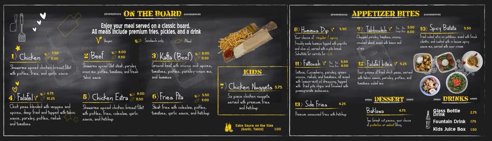 Each box includes your choices of wrap, side & dip, and pita bread.