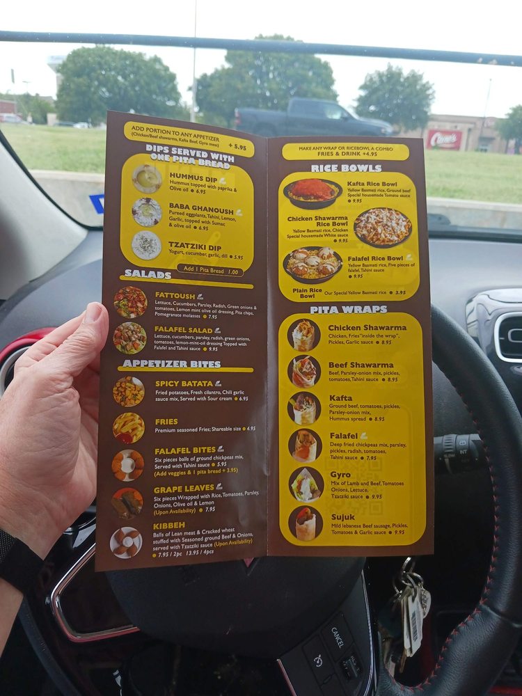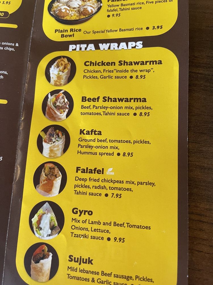 Each box includes your choices of entre and 2 sides, safffron basmati rice, and pita bread.